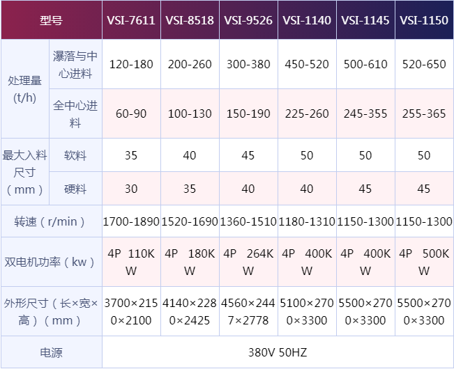 vsi沖擊式制砂機有好多種不一樣的規(guī)格型號,而每種型號的打沙機搭配的電動機、機械的轉(zhuǎn)速、所能解決的物料的粒度范圍和機械的總重量等是不一樣的,技術(shù)參數(shù)是用戶選購機械時的重要參數(shù)資料,關(guān)于vsi沖擊式制砂機的詳細參數(shù)請看下文技術(shù)參數(shù)表。