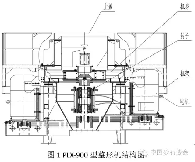 立軸沖擊制砂機(jī)機(jī)主要由上蓋、機(jī)身、機(jī)架、轉(zhuǎn)子、電機(jī)及傳動(dòng)幾部分組成。結(jié)構(gòu)如圖1所示。
