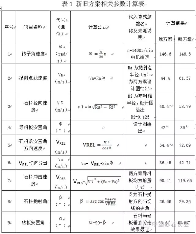 新舊方案的參數(shù)變化,導(dǎo)致了石料沖擊速度VRES和拋射角β的不同。為獲得佳的碰撞破碎效果,布置在機(jī)身腔壁的砧板的安置角α相應(yīng)作調(diào)整。兩個(gè)方案相關(guān)參數(shù)的計(jì)算過(guò)程見(jiàn)表1。
