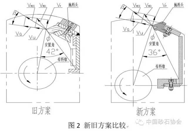 在轉(zhuǎn)速、葉輪直徑、布料錐大小不變的前提下,著眼于盡可能增大拋射點(diǎn)的半徑Ra,適當(dāng)調(diào)整導(dǎo)料安置角φ,提出了改進(jìn)方案。新舊方案拋料頭的布置見(jiàn)圖2。