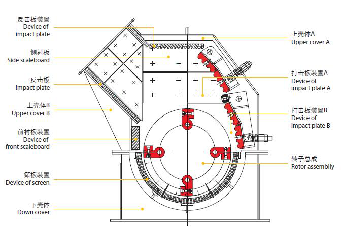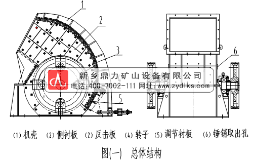 錘式破碎機主要由機殼、轉子、反擊板、調節(jié)襯板等部分組成。