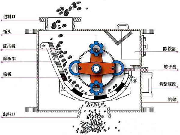 環(huán)錘破工作原理:石頭進(jìn)入粉碎腔后,先取得隨轉(zhuǎn)子高速運(yùn)行的環(huán)錘的沖擊影響而破 碎,被破碎的石頭從環(huán)錘處取得動(dòng)能,高速地沖向破碎板,取得第次破碎,然后落到蓖條上,取得環(huán)錘地?cái)D壓和磨剝深度破碎,并透過(guò)篩孔排出。