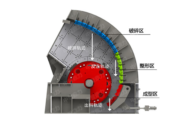 通過電動機帶動轉(zhuǎn)子的高速旋轉(zhuǎn),由于轉(zhuǎn)子的高速旋轉(zhuǎn),當(dāng)物料進(jìn)入板錘作業(yè)區(qū)時,受到錘頭的沖擊、碰撞、剪切等作用而破碎,已破碎的石料被拋到反擊裝置上得到再次破碎,之后被彈回板錘作用區(qū)重新破碎,石料經(jīng)過多次反復(fù)破碎直至合格被排出。