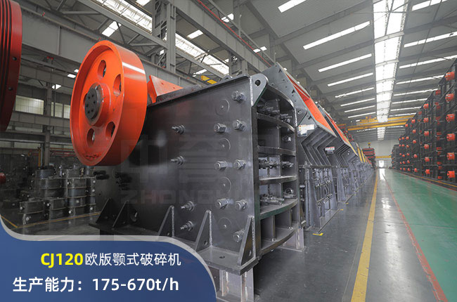 CJ120歐版顎式破碎機,進料口尺寸1200×870mm,進料粒度700mm,出料大小70-200mm,電機功率132kw,時產(chǎn)可達670噸。