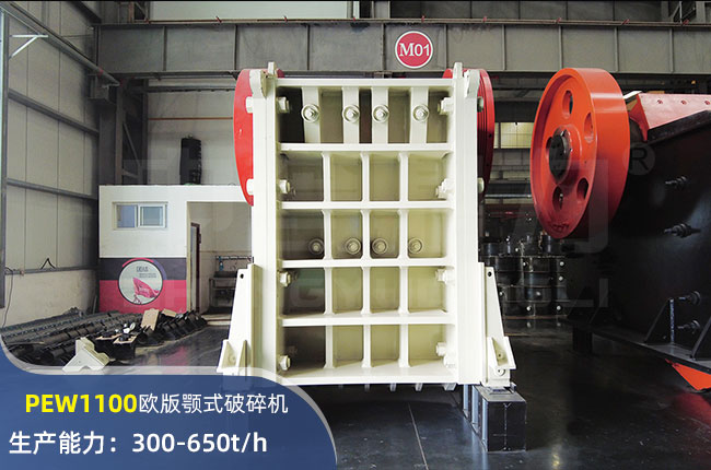 PEW1100顎式破碎機進料口尺寸1100×1200mm,進料粒度930mm,出料大小150-275mm,電機功率185kw,時產可達650噸左右。