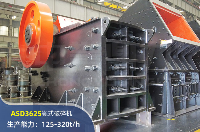 ASD3625顎式破碎機(jī)進(jìn)料口尺寸910×630mm,進(jìn)料粒度≤425mm,出料大小≤50mm,電機(jī)功率90kw,時產(chǎn)320噸左右。