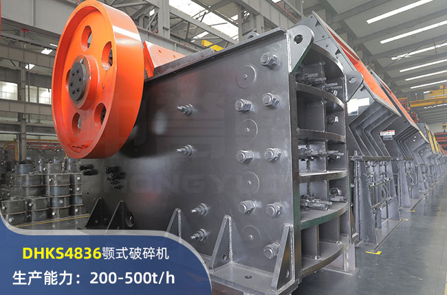 DHKS4836顎式破碎機進料口尺寸1220×910mm,進料粒度770mm,出料大小90-250mm,電機功率160kw,時產(chǎn)500噸左右。