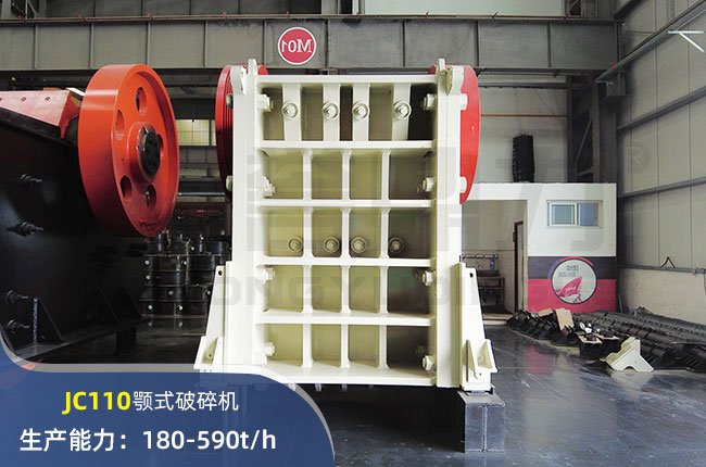 JC110顎式破碎機進料口尺寸1100×860mm,進料粒度≤720mm,出料大小≤70mm,電機功率110kw,時產(chǎn)量在590噸左右。