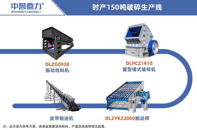 設(shè)備配置:ZG0930振動給料機(jī)+PCZ1410重錘式破碎機(jī)+2YKZ2060圓振動篩+皮帶輸送機(jī)
