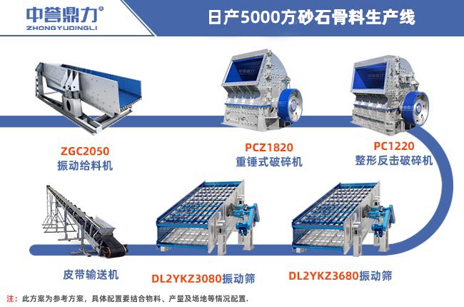 設(shè)備配置:PCZ1820重型錘式反擊破碎機(jī)、PC1220整形式破碎機(jī)、3YKZ3070系列振動篩、輸送機(jī)等設(shè)備。