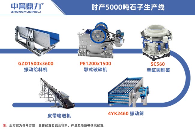 時(shí)產(chǎn)5000噸石子生產(chǎn)線屬于大產(chǎn)量的生產(chǎn)規(guī)模,設(shè)備配置根據(jù)物料硬度的不同,有處理物料硬度比較大的設(shè)備配置,有處理物料硬度比較小的設(shè)備配置,總體設(shè)備配置比較靈活,可以根據(jù)客戶的需求選擇: