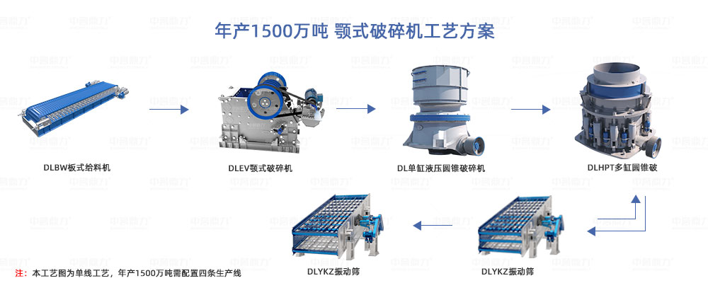年產(chǎn)1500萬噸產(chǎn)能較大,折合成時產(chǎn)量,大概每小時要產(chǎn)4000-5000噸,結(jié)合各種碎石設備的產(chǎn)能,有如下幾種設備配置方案: