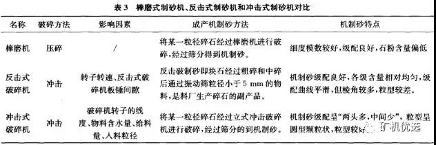 有些人士認為應(yīng)采用棒磨機,因為棒磨機生產(chǎn)過程中磨棒對石料粉磨有選擇性、逐步粉磨,過磨現(xiàn)象少。但是,棒磨機存在產(chǎn)量低、運行成本高、人工勞動強度大等缺陷,不建議采用。在實際生產(chǎn)中可采用反擊式和沖擊式破碎機聯(lián)合制砂(也有采用棒磨機和沖擊破聯(lián)合制砂),獲得粒型好、級配好、產(chǎn)量高的機制砂。