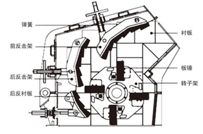 1214反擊破碎機內(nèi)部結(jié)構(gòu)主要由板錘、轉(zhuǎn)子架、轉(zhuǎn)子、反擊襯板、彈簧等組成。