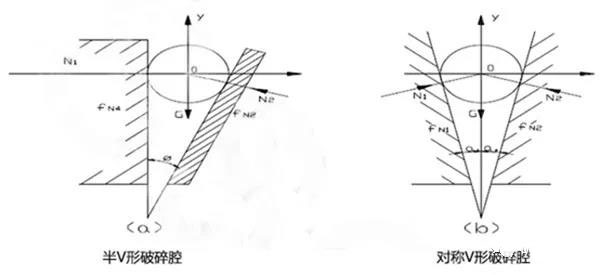 V形腔結(jié)構(gòu)使實(shí)際進(jìn)料口寬度與名義進(jìn)料口寬度相一致,并且更容易排料,相對(duì)來說不易發(fā)生堵料現(xiàn)象,不易蹦料,更深的破碎腔,無死區(qū),破碎效率更高。