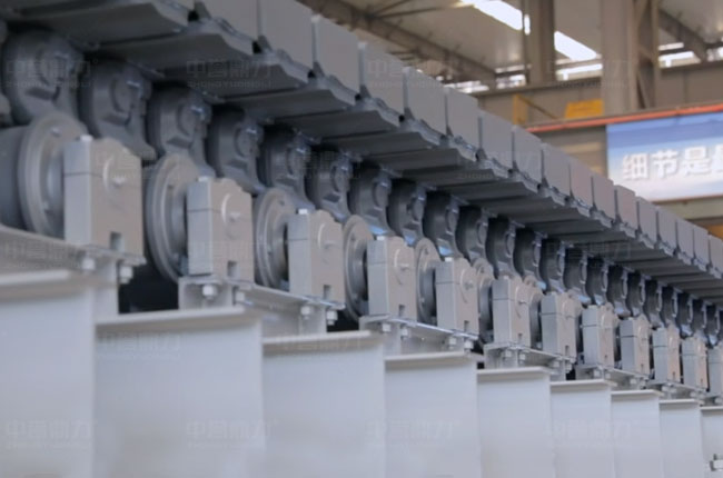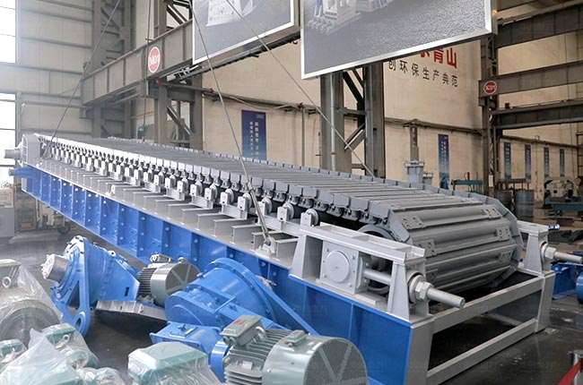 板式給料機的組成部分包括機架、主軸裝置、驅(qū)動裝置(電動機、聯(lián)軸器、減速器)、鏈板裝置、拉緊裝置、支重輪、托鏈輪等。