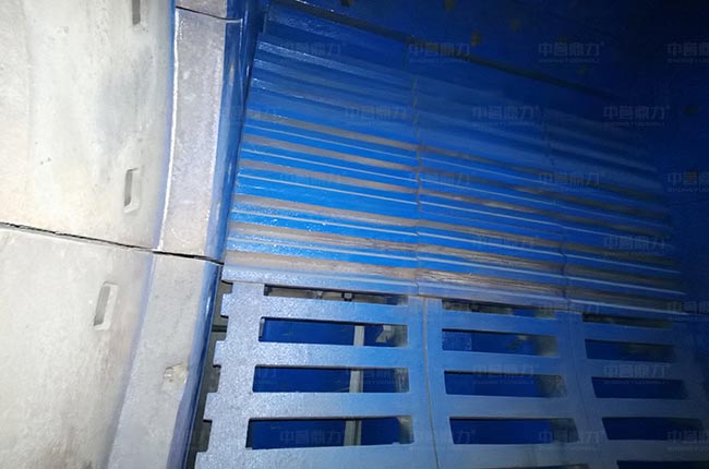 襯板、篦板加厚,增加耐磨性。主、側(cè)襯板的固定采用六角頭高強螺栓,螺栓頭部藏于襯板內(nèi),防止螺栓磨損,襯板脫落。