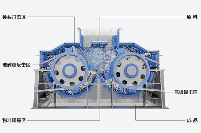 兩個轉子相對運轉,促使破碎腔內(nèi)物料相互撞擊,形成石料自粉碎,減少錘頭及部件的磨損和消耗。