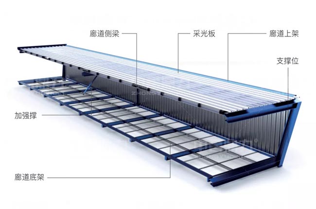 中譽(yù)鼎力DL組裝式廊道(砂石運(yùn)輸廊道),組成部分包括廊道底架、加強(qiáng)撐、波紋側(cè)板、底部花紋板、廊道側(cè)梁、采光板、廊道上架、支撐位等組成。廊道內(nèi)還設(shè)置有電纜、照明裝置、監(jiān)控?cái)z像頭固定位置。