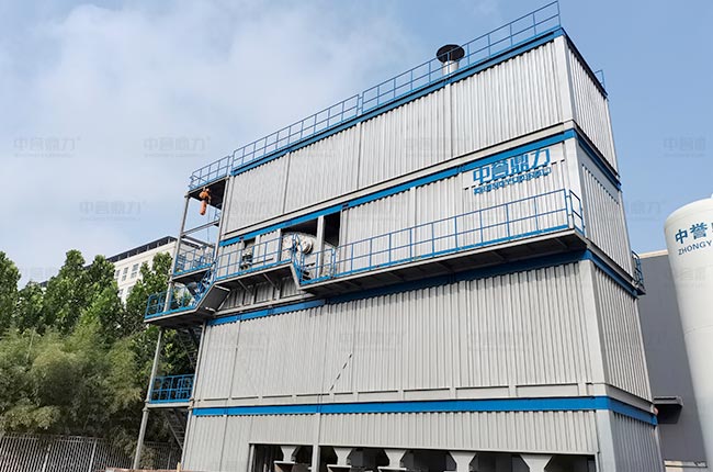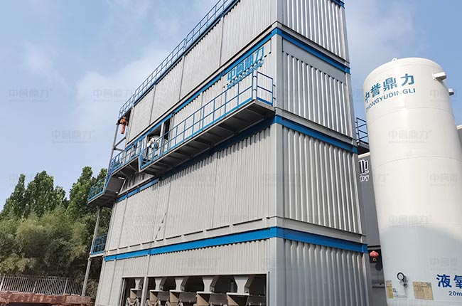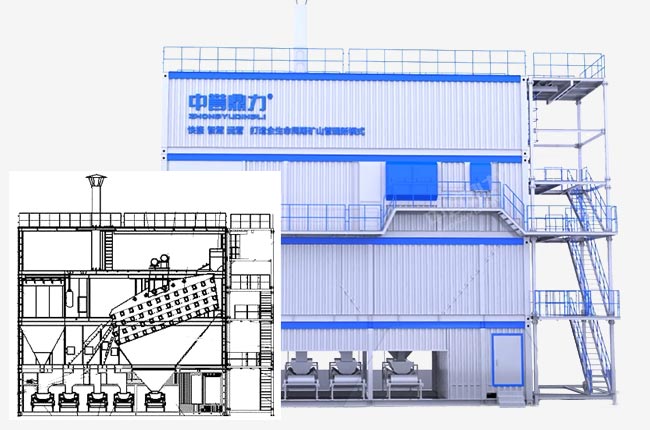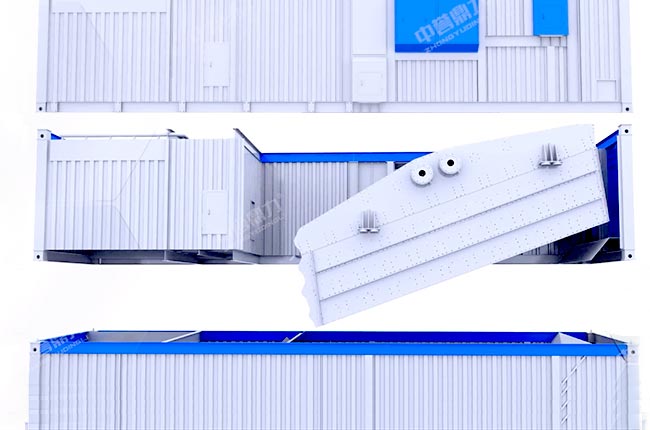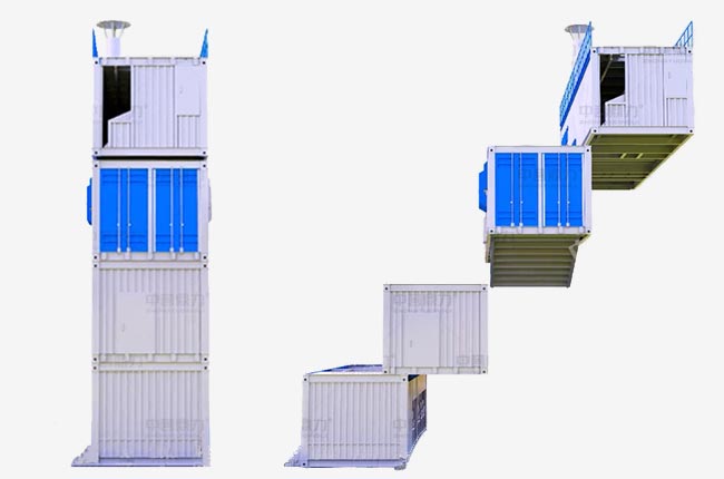 組裝式篩分樓分四層集裝箱設(shè)計,通過螺栓疊加連接,頂層模塊上部煙囪直通除塵器排風(fēng)管;