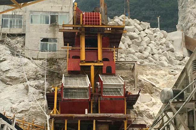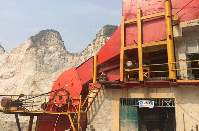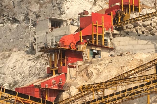 原石料通過卸料倉,由棒條式給料機(jī)對(duì)原料進(jìn)行預(yù)處理,篩下的石料通過振動(dòng)篩篩選,反擊破細(xì)碎,再次篩分,其余大規(guī)格的骨料通過給料機(jī)均勻連續(xù)送進(jìn)1615重錘破破碎,直接通過振動(dòng)篩篩分,部分大規(guī)格石料會(huì)經(jīng)過反擊破二次加工,其余混合料通過振動(dòng)篩篩分不同規(guī)格的石料。