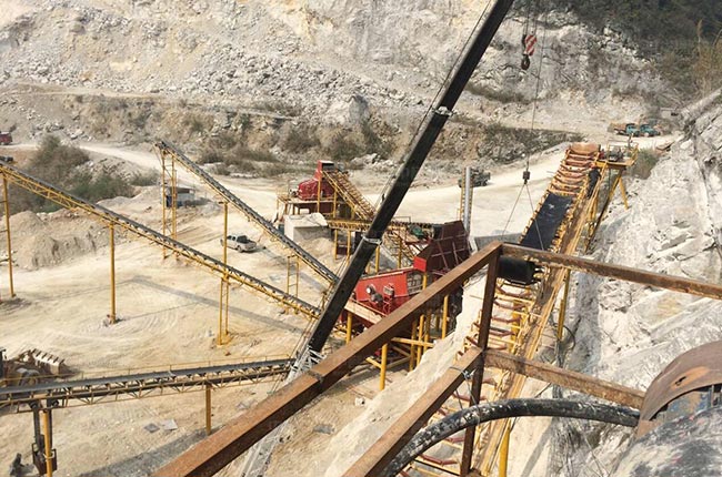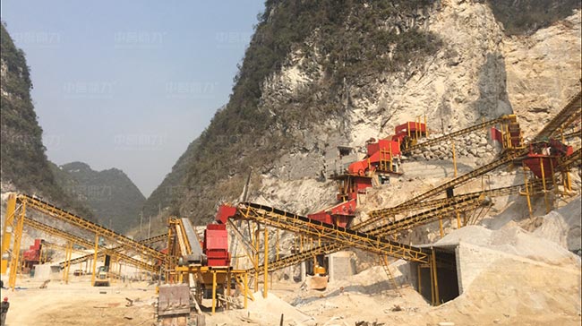 根據(jù)現(xiàn)場(chǎng)地勢(shì),采用階梯式設(shè)計(jì),給料機(jī)下重錘破,重錘破下直接跟兩臺(tái)振動(dòng)篩篩分碎石料,部分符合成品要求的石料會(huì)通過皮帶機(jī)送至成品料堆,其余大規(guī)格的會(huì)在反擊破進(jìn)行二次破碎。