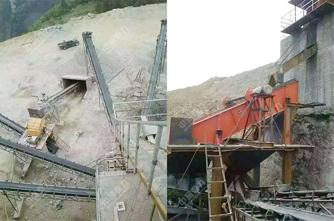 該產(chǎn)線依山而建,利用山體的坡度,將原料直接送進主破碎機內(nèi)進行粗碎,粗碎后的物料經(jīng)過篩分后,再進入二破設(shè)備內(nèi)進行整形中細碎,生產(chǎn)出來的物料經(jīng)過篩選分級后輸送至相對應(yīng)的成品料堆。