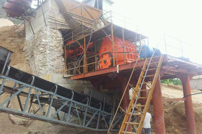 山上的石頭入振動(dòng)給料機(jī),由給料機(jī)除去泥土后送進(jìn)重錘破碎機(jī)內(nèi)進(jìn)行粗碎處理,出來的料進(jìn)過篩分后,符合進(jìn)料粒度的進(jìn)入雙轉(zhuǎn)子制砂機(jī)內(nèi)生產(chǎn)機(jī)制砂,不符合進(jìn)料粒度的再返回重錘破內(nèi)進(jìn)行破碎,形成閉路循環(huán)。