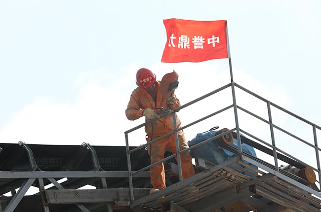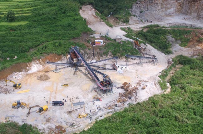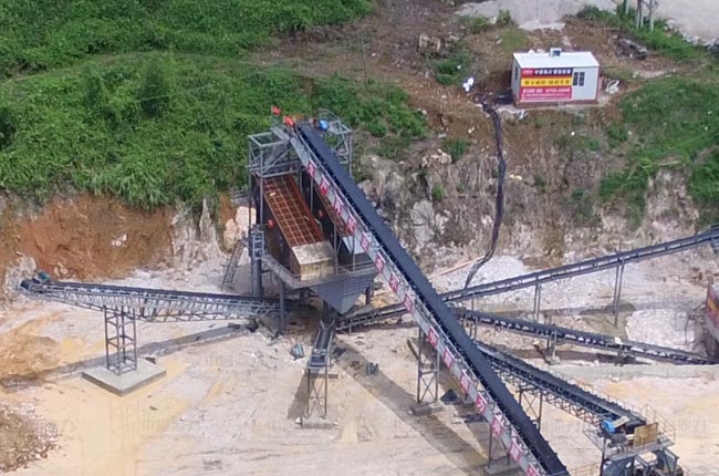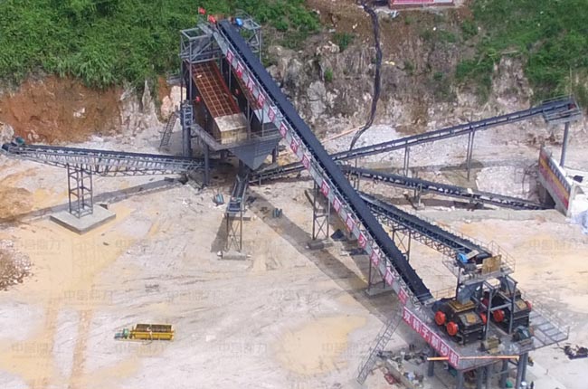 湖南抗應(yīng)洞采石場時產(chǎn)300噸機(jī)制砂生產(chǎn)線采用500*750顎破機(jī)對物料進(jìn)行粗碎,通過皮帶機(jī)送至中轉(zhuǎn)料堆,其后再通過皮帶機(jī)將碎石料送至兩臺ZSJ1213雙轉(zhuǎn)子制砂機(jī)細(xì)碎制砂,然后通過兩臺3YKZ2470振動篩篩分,頭層篩網(wǎng)石料會通過皮帶機(jī)送至中轉(zhuǎn)料堆再次通過制砂機(jī)加工,其余石料根據(jù)成品皮帶機(jī)送至相應(yīng)的成品料堆。