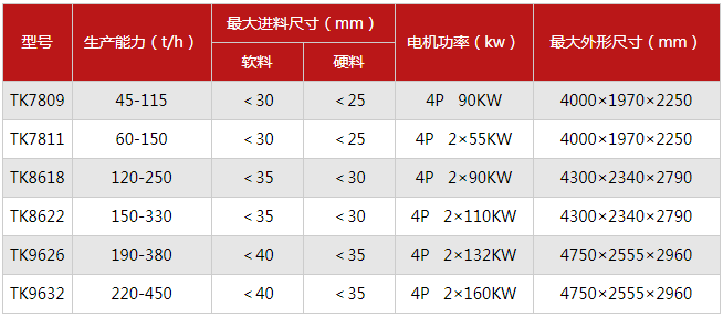 2、tk制砂機(jī)械:一種的造沙機(jī)機(jī)械,入料(軟料)不過50毫米、(硬料)不過45毫米、處理量(瀑落與送料)120-520噸/時(shí)、(送料)60-260噸/時(shí)。
