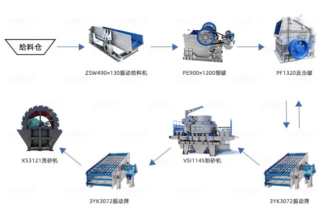 上述流程圖為912碎石機破碎制砂流程圖,即可生產(chǎn)石子骨料還可以生產(chǎn)機制砂、水洗砂。
