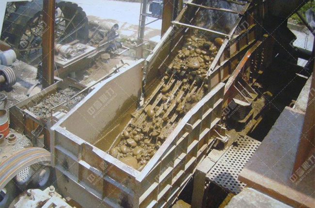 加工原料經(jīng)振動送料機定期、定向?qū)⒓庸ぴ纤腿雙e鄂破機進(jìn)行粗碎,送料的此時,預(yù)先篩選分級出加工原料中夾雜的異物,防止其進(jìn)入碎石機的機腔,毀壞機器,從pe鄂破機出來后,振動篩篩選出破碎合格的部分送入二級破石機械(反擊礦山碎石機、圓錐碎石機)進(jìn)行二段破碎,破碎至更小的顆粒,便于進(jìn)行制砂處置,石子打砂機對二段破碎合格的加工原料進(jìn)行沖擊制砂,根據(jù)成品要求,將性能調(diào)改至滿意數(shù)據(jù),生產(chǎn)出期望粒度的成品砂石,加工原料從石子打砂機出來,會攜帶有揚塵,砂石洗選機械可以將包覆在砂石表面的揚塵,和中間夾雜的異物清洗干凈,后獲得干凈的河道石成品砂石。