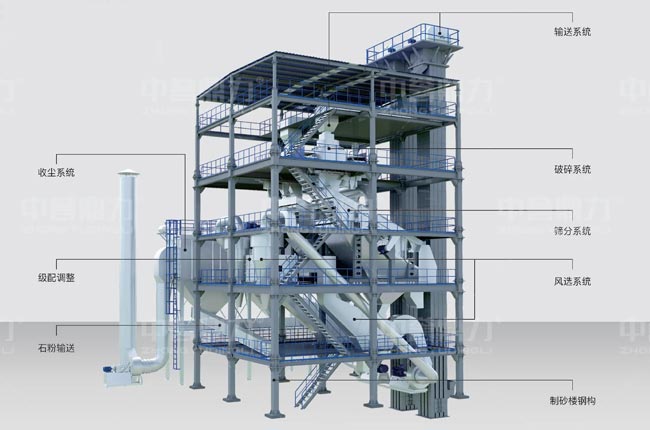 制砂樓(塔樓式制砂樓)采用干式制砂工藝,通過鋼結(jié)構(gòu)疊放設(shè)計(jì),將制砂、篩分、選粉等系統(tǒng)集中于立體空間內(nèi),具有占地較小、綠色環(huán)保、級(jí)配可控、智能操縱等優(yōu)勢(shì)。