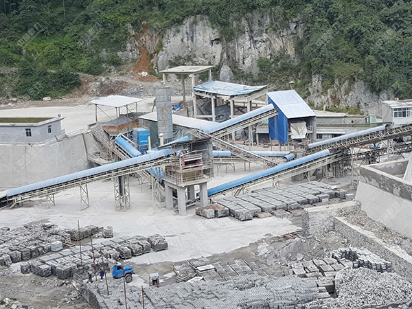 花崗巖原料經振動給料機均勻給料,進入液壓顎式破碎機進行粗破,然后進入液壓圓錐破碎機進行二破,二破出來的石料用振動篩進行篩分,返料進入二破,小于150mm成品料進入另外的液壓圓錐破碎機進行三段破碎,大于40mm進入液壓圓錐破碎機再次破碎,小于40mm的進入沖擊式破碎機整形,成品出0-5mm,5-10mm,10-20mm,20-31.5mm的骨料,該生產線產量大、粒型好。